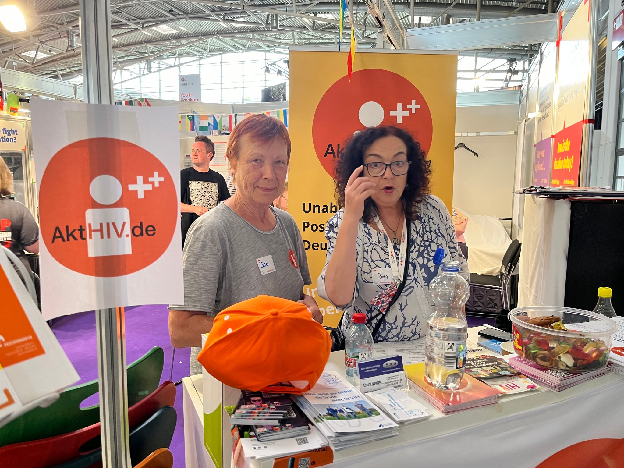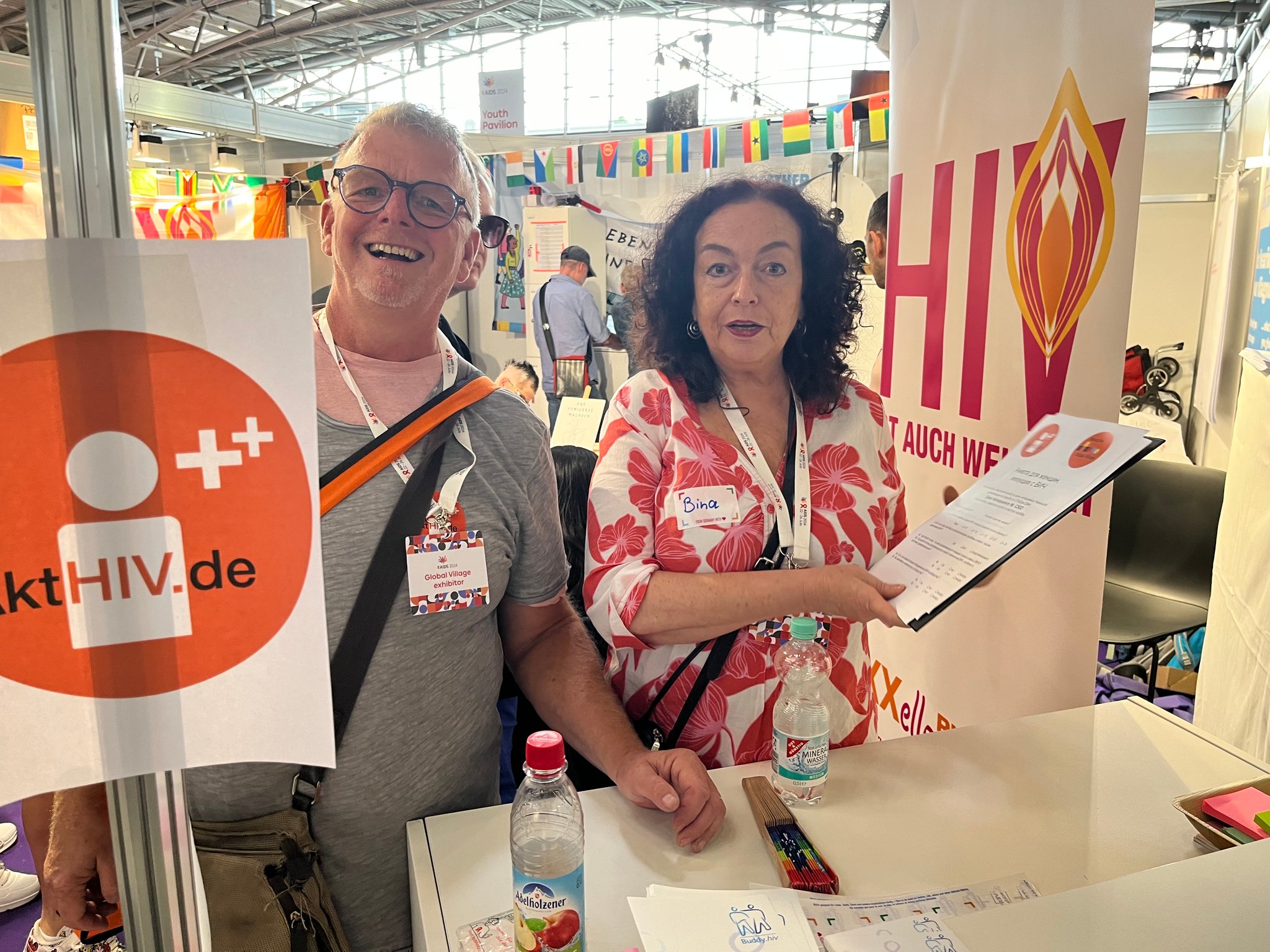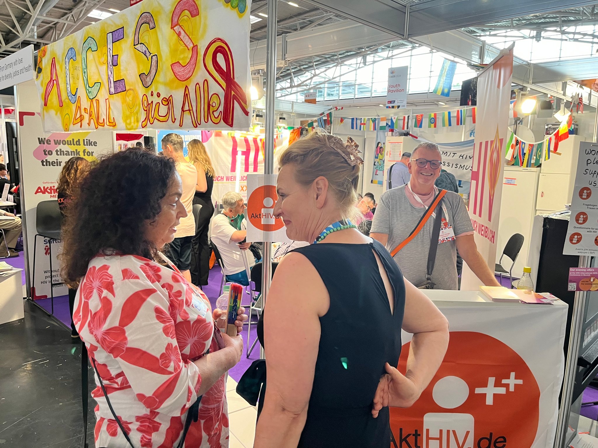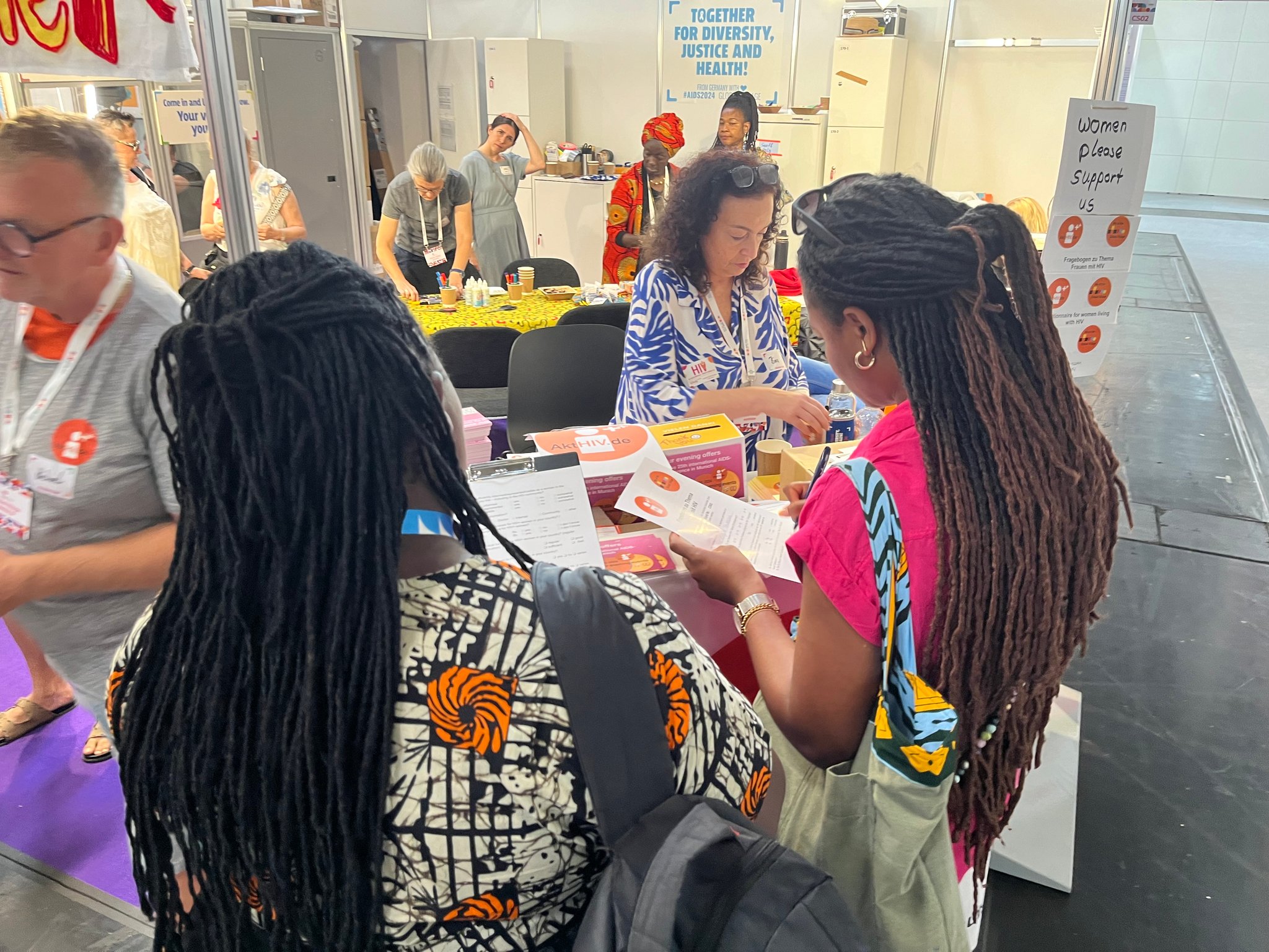 Auf der Welt AIDS-Konferenz vom 22.-26 Juni 2024 in München waren wir im Global Village am Deutschen Community Stand der DAH für jeweils eine Stunde vertreten. Dort haben wir uns mit vielen internationalen Gästen unterhalten und Fragebögen zum Thema HIV und Frauen verteilt. Wir wollten einen Eindruck über die Situation von HIV-positiven Frauen aus dem Global Village gewinnen. Die Gespräche waren super spannend und wir haben richtig gutes Feedback bekommen. In der kurzen Zeit haben wir über 120 ausgefüllte Fragebögen zurückbekommen. Einfach klasse! Vielen Dank an Bina, Gabi und Michael für euren tollen Einsatz.